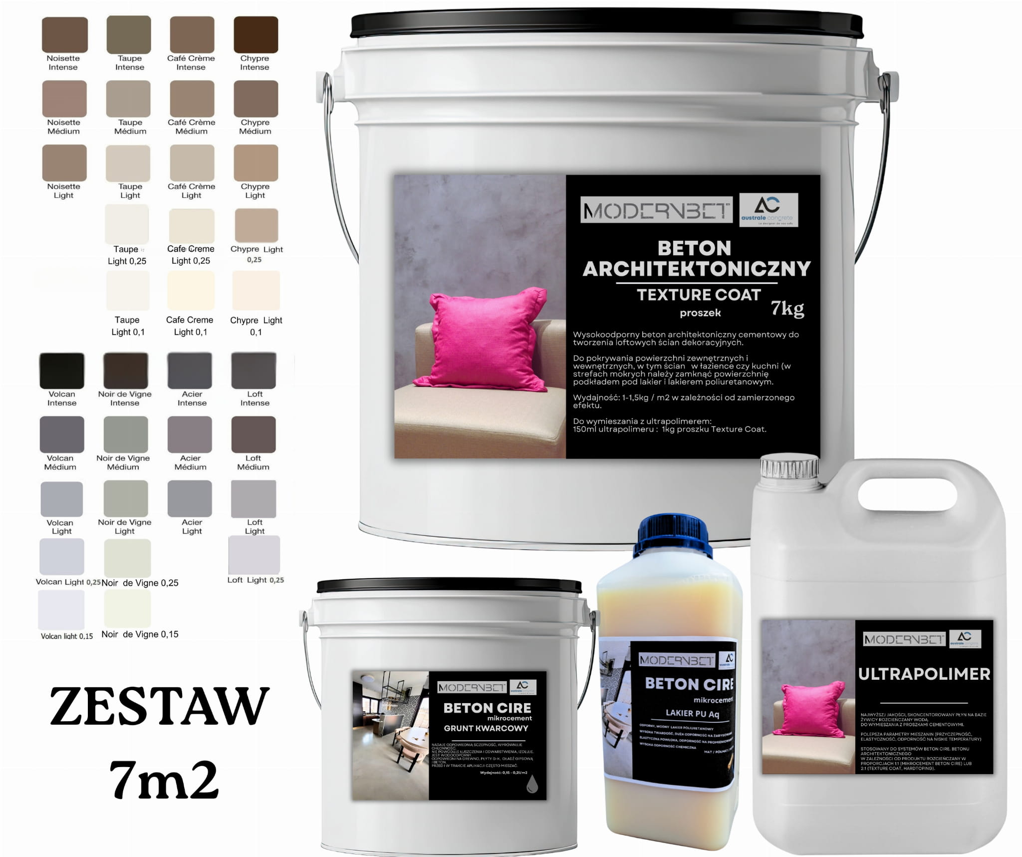 Francuski beton architektoniczny TextureCoat na ściany i elewacje, idealny również do łazienek i kuchni. Szeroka gama barw - Twój beton nie musi być szary. Zestaw do wykonania do 7m2 powierzchni w strefach mokrych typu prysznic, opaska kuchenna nad blatem itp. Beton architektoniczny TextureCoat to nowoczesny, trwały materiał wykończeniowy, który łączy w sobie surową estetykę z wyjątkową odpornością. Wykonany z wysokiej jakości mieszanki cementowo-polimerowej, stanowi pełnowartościową warstwę betonu architektonicznego, a nie jedynie masę imitującą jego wygląd (jednoskładnikowe, gotowe masy dekoracyjne). Dzięki swojej strukturze i właściwościom fizycznym beton architektoniczny doskonale sprawdza się zarówno we wnętrzach, jak i na elewacjach budynków. Jest odporny na warunki atmosferyczne, promieniowanie UV, wilgoć oraz uszkodzenia mechaniczne. Jego powierzchnia może być gładka, porowata lub z charakterystycznymi przetarciami, co pozwala uzyskać różnorodne efekty wizualne – od minimalistycznych po industrialne. To materiał, który nie wymaga dodatkowego wykończenia ani malowania (barwiony w masie), a z biegiem czasu zyskuje jeszcze bardziej naturalny charakter. Beton architektoniczny TextureCoat to wybór dla osób ceniących trwałość, autentyczność i ponadczasowy design.